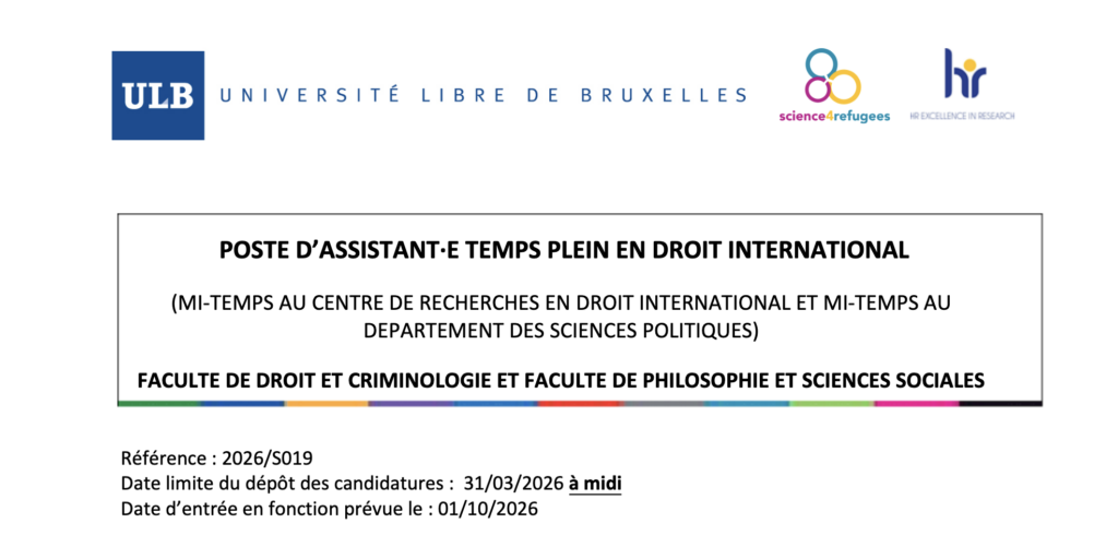 Le Centre de droit international de l’ULB engage un.e assistant.e à temps plein au 1er octobre 2026