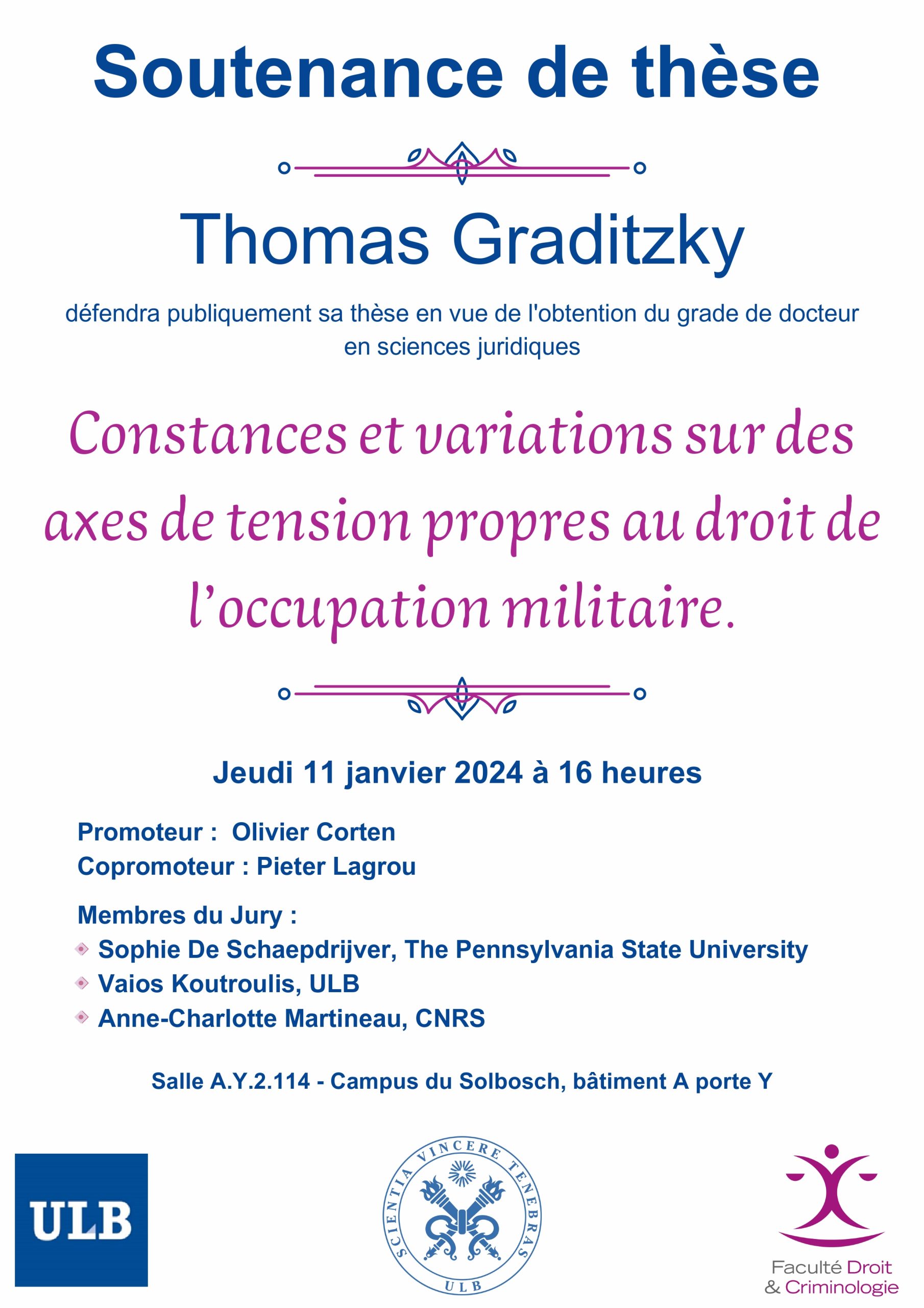 Le Centre de droit international a le plaisir de vous convier à la soutenance publique de la thèse de doctorat en sciences juridiques de Monsieur Thomas Graditzky, intitulée "Constances et variations sur des axes de tension propres au droit de l’occupation militaire".